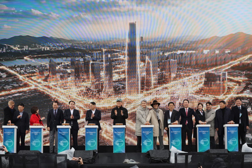오세훈 서울시장이 지난해 11월27일 서울 용산국제업무지구 기공식에서 정정래 한국철도공사 사장직무대행, 국민의힘 권영세 의원 등 참석자들과 기념촬영하고 있다. [연합]