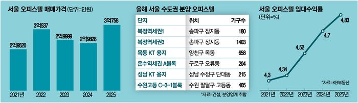계속 치솟는 월세 덕에 임대수익률이 상승하는 추세인 것도 오피스텔 전망을 밝게 하는 요인이다. 작년 12월 기준 서울 오피스텔 임대수익률은 4.83%를 기록 중이다. 금리 지표 중 하나인 국고채 5년 금리가 현재 3.1~3.2%라는 점을 감안하면 오피스텔 수익률이 상당히 높은 셈이다. 여기에 부동산 시장에선 오피스텔 공급이 급감한 것도 앞으로 매매가격과 임대수익률을 끌어올릴 수 있을 것으로 보고 있다. 부동산R114에 따르면 올해 서울 오피스텔 입주 물량은 1447실로, 공급이 가장 많았던 2020년(2만2225실) 대비 93.5% 급감한 수준이다.다만 전문가들은 공급 감소와 임대수익률 상승, 거래 회복이라는 긍정적 지표에도 불구하고 오피스텔 투자에 선별적으로 접근해야 한다고 지적한다. 오피스텔은 기본적으로 자본이익(시세차익)보다 안정적인 월세 수익을 노리는 상품이기 때문에 입지 등을 더 꼼꼼히 따져야 한다는 것이다. 입지 경쟁력이 떨어지거나 노후화된 단지, 과도한 분양가가 책정된 오피스텔은 여전히 공실과 수익률 저하에 시달릴 위험이 있다는 뜻이다. 고준석 연세대 상남경영원 주임교수는 “오피스텔은 매매가격이 급등하기보다 월세가 먼저 오르며 임대 수익률이 개선되고, 매매가격이 후행적으로 회복되는 모습을 주로 보인다”면서 “이 같은 점을 고려하면 직장인이 많이 몰리고, 교통망이 좋은 지역을 위주로 접근해야 한다”고 지적했다.