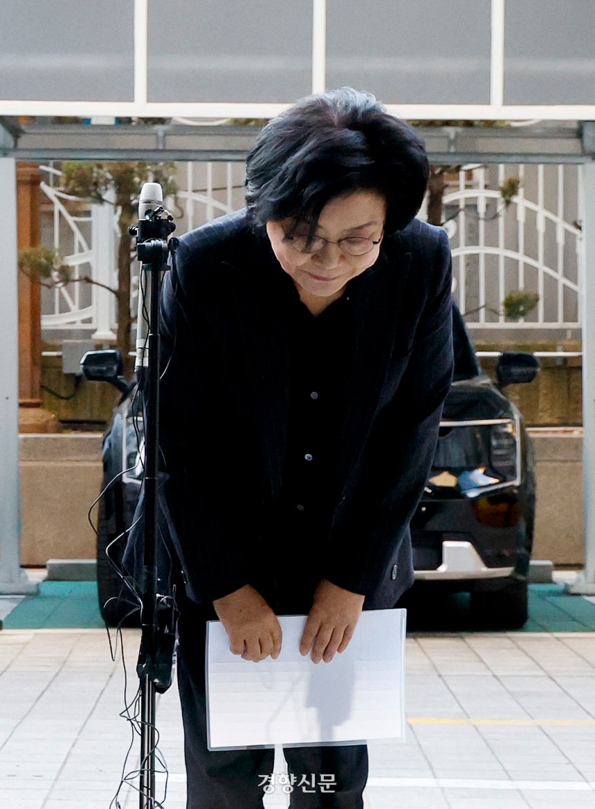 이혜훈 초대 기획예산처 장관 후보자가 지난달 30일 서울 중구 예금보험공사에 마련된 인사청문회 준비 사무실로 출근하며 과거 내란 옹호와 관련해 사과문을 읽고 허리 숙여 인사하고 있다. 문재원 기자
