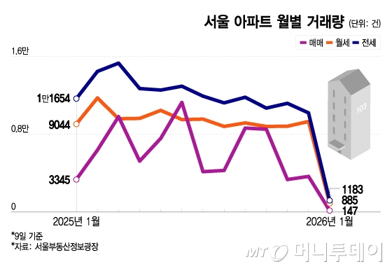 서울 아파트 월별 거래량/그래픽=이지혜 지난해 10·15 부동산대책 이후 서울 전역이 토지거래허가구역으로 지정된 후 서울 아파트 월별 거래량이 급격히 줄어들고 있다. 표면적으로는 거래절벽에 가까운 모습이지만 이를 수요위축이나 시장냉각으로 해석하기는 어렵다는 분석이 힘을 얻는다. 토지거래허가제(이하 토허제)라는 강력한 제도가 거래를 물리적으로 막으면서 통계상으로만 시장이 식은 것처럼 보이는 '착시안정'이 나타난다는 지적이다.11일 서울부동산정보광장에 따르면 서울 아파트 월별 거래량은 지난해 3월 9800건, 6월 1만1264건으로 월 최고치를 기록한 이후 10월에도 8797건으로 비교적 활발한 흐름을 보였다. 그러나 토허제가 본격 시행된 이후 상황은 급변했다. 11월 거래량은 3336건, 12월은 3658건으로 거래량이 절반 이하로 쪼그라들었다.