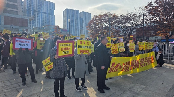 세운4구역 토지주들이 11일 서울 종로구에서 기자회견을 열고 국가유산청과 문화체육관광부의 대법원 판결 수용을 요구하는 현수막을 들고 있다. 2025.11.11 [사진=이수현 기자]12일 한호건설은 서울시가 시장 교체 때마다 완전히 다른 세운지구 개발구상을 내놓았으며, 이로 인해 첫 토지매입 시기인 2006년부터 최소 네 차례에 걸쳐 피해를 입었다고 밝혔다. 한호건설은 2006년부터 세운상가 19지구와 25지구 등 세운6-3구역에서 2000~3000평을 매입했다.