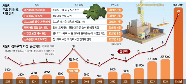 서울시의 정비구역 지정과 이에 따른 공급 계획 가구 수는 2021년 4월 오세훈 시장의 보궐선거 당선에 따른 복귀 이후 매년 증가했다. 2021년 7곳(7400가구)에서 △2022년 14곳(1만 4700가구) △2023년 16곳(2만 3100가구) △2024년 22곳(2만 6200가구)으로 늘어났다. 특히 지난해는 49곳(9만 2700가구, 9월 기준)으로 2023년보다 구역 기준으로 두 배 이상 증가했다.