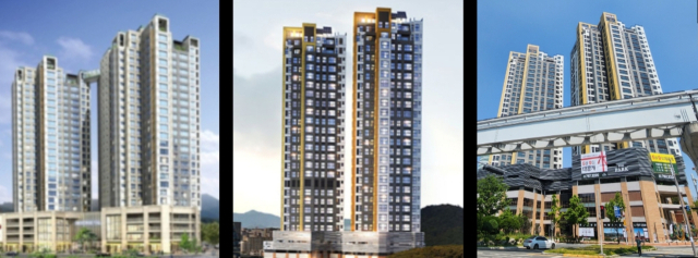 '더파크 수성못'의 조감도와 완공현장. 왼쪽부터 초기 조감도, 사업계획 변경 승인 이후 조감도, 완공 조감도.