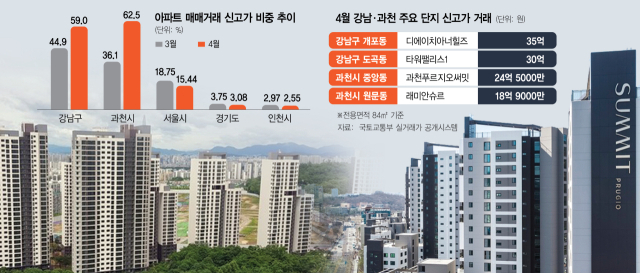 매물 수와 거래가 급격히 줄어든 반면 매매거래 중 신고가 비중은 늘었다. 부동산 프롭테크 기업 직방에 따르면, 4월 강남구 아파트 신고가 매매거래 비중은 59.0%로 전월 44.9% 대비 14.1% 포인트 늘었다. 2022년 4월(53.7%) 이후 3년 만에 신고가 거래 비중이 절반을 넘어섰다.