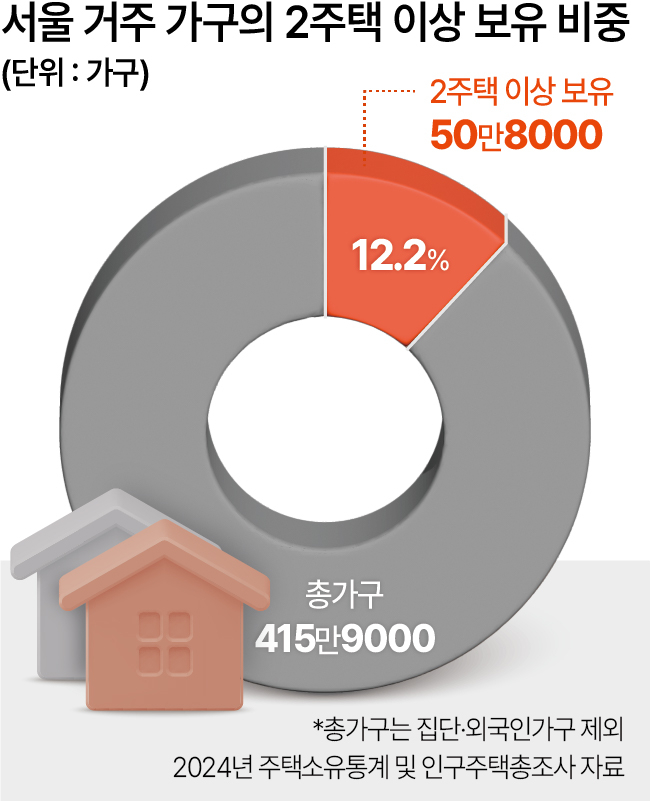서울에서 ‘비거주 주택’을 팔 수 있는 다주택가구는 전체의 12% 수준이다. 국가데이터처의 ‘주택소유 통계 및 인구주택 총조사’에 따르면, 가장 최근 통계인 2024년 서울 거주 가구는 415만9000가구(일반 가구 기준)로 이 가운데 2주택 이상 보유 가구는 50만8000가구였다. 전체의 12.2% 수준이다. 산술적으로 다주택자들이 한채를 제외하고 모두 팔았을 때 50만가구는 나올 수 있다는 얘기다.
