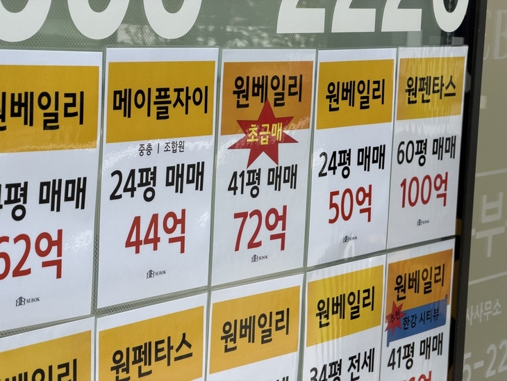 27일 찾은 서울 서초구 반포동 래미안원베일리 아파트 단지 내 공인중개사무소에 초급매 안내 광고지가 붙었지만 낙폭은 크지 않았다. 윤성현 기자