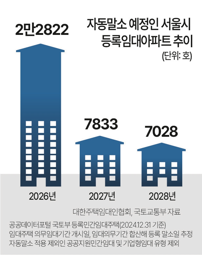 9일 대한주택임대인협회에 따르면 올해 임대의무기간이 종료되는 서울 아파트(국토교통부 등록민간임대주택, 2024년 말 기준)는 2만2822호에 달한다. 2027년과 2028년에는 각각 7833호, 7028호로 집계돼 앞으로 3년간 총 3만7683호의 임대의무기간이 종료된다.