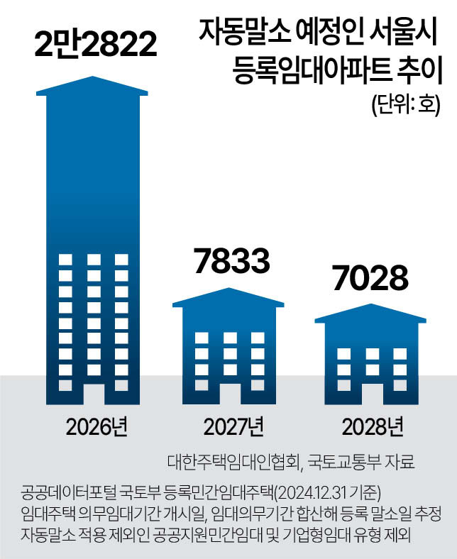 9일 대한주택임대인협회에 따르면 올해 임대의무기간이 종료되는 서울 아파트(국토교통부 등록민간임대주택, 2024년 말 기준)는 2만2822호에 달한다. 2027년과 2028년에는 각각 7833호, 7028호로 집계돼 앞으로 3년간 총 3만7683호의 임대의무기간이 종료된다.