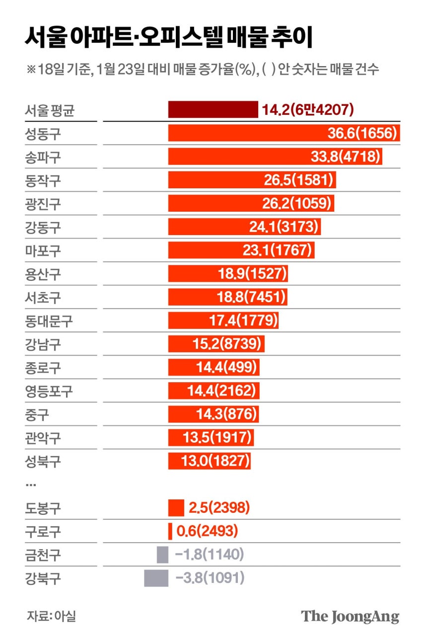 다만 지역별로는 가격 둔화세가 차이를 보일 수 있다. 최근 매물이 두드러지게 증가한 지역은 성동구(1656건, 1월 23일 대비 증가율 37%), 송파구(4718건, 34%), 동작구(1581건, 26%)를 비롯해 광진·강동·마포·용산·서초·강남구 등 한강벨트와 강남권이다. 현장 중개업소에선 “다주택자뿐 아니라 1주택자 중에서도 향후 보유세 인상 등을 우려해 집을 내놓는 고령자가 적지 않다”고 입을 모았다.