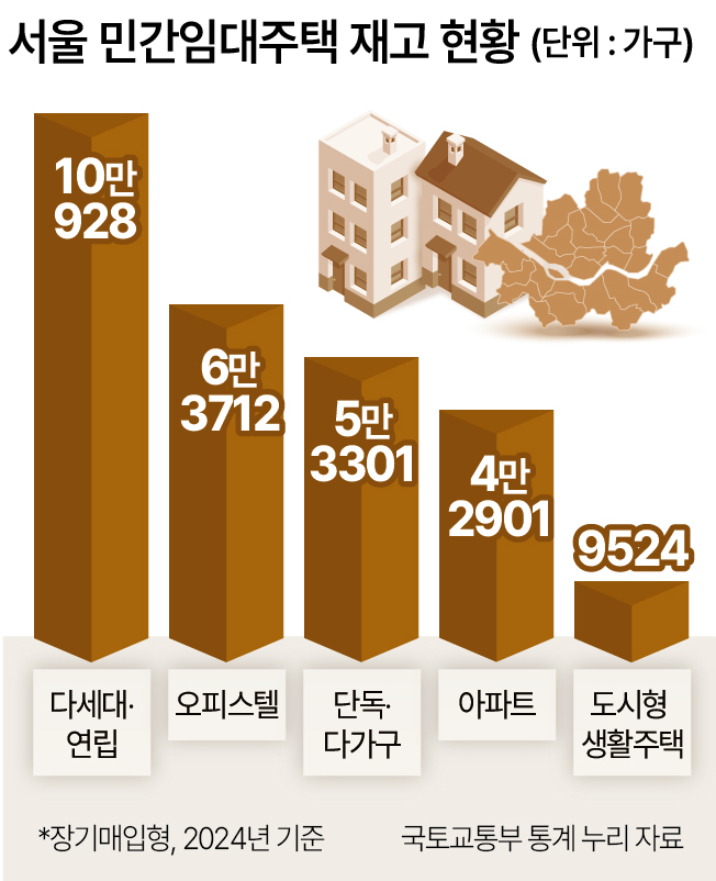 국토교통부 통계누리에 따르면 2024년 기준 서울의 장기 매입 민간임대주택 재고는 총 26만9567가구로, 이 중 다세대·연립이 10만928호(37%)로 가장 많았다. 이어 오피스텔 6만3712호(24%), 단독·다가구 5만3301호(20%), 아파트 4만2019호(16%), 도시형생활주택 9524호(3%) 순이다.