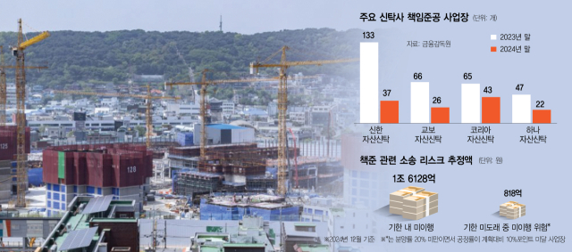 이는 신탁사들이 신규 수주를 중단하고 책임준공 의무 기한이 도래한 사업장의 인허가를 서둘러 준공을 유도한 데 따른 결과다. 책임준공은 건설사가 약속한 기한 내에 공사를 마치지 못하면 신탁사가 금융 비용 등 모든 책임을 떠안는 일종의 보증 상품이다. ‘고위험·고수익’ 구조로 건설 경기가 좋을 때는 효자 노릇을 했지만 최근 부도 건설사가 늘어나면서 실적 발목을 잡는 리스크로 떠올랐다.
