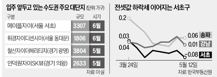 콧대 높던 서울 서초구 아파트 전셋값이 7주 연속 하락세를 보이고 있다. 3000가구 넘는 ‘메이플자이’의 집들이 시점이 다가오면서 전세 물량이 대거 쏟아지는 영향으로 풀이된다. 서울 동대문구와 경기 광명, 인덕원 일대 등 수도권 주요 지역에서도 대단지 입주가 예정돼 있다. 전세 수요자라면 ‘입주장’이 펼쳐지는 지역을 노려볼 만하다는 평가가 나온다.◇ 메이플자이 전세 매물 쑥18일 한국부동산원에 따르면 서초구 아파트 전셋값은 이달 둘째주(지난 12일 기준) 0.08% 떨어졌다. 지난 3월 말부터 7주 연속 내리막길을 걷고 있다. 서울 전체 아파트 전셋값이 15주 연속 오름세를 보인 것과 달리 강남권 핵심 주거 지역인 서초구는 마이너스를 거듭했다. 잠원동에서 3307가구 규모의 메이플자이가 다음달 입주를 앞두고 있어서다. 부동산 플랫폼 업체 아실에 따르면 이 단지 전세 물건은 3월 초부터 시장에 풀리기 시작했다.