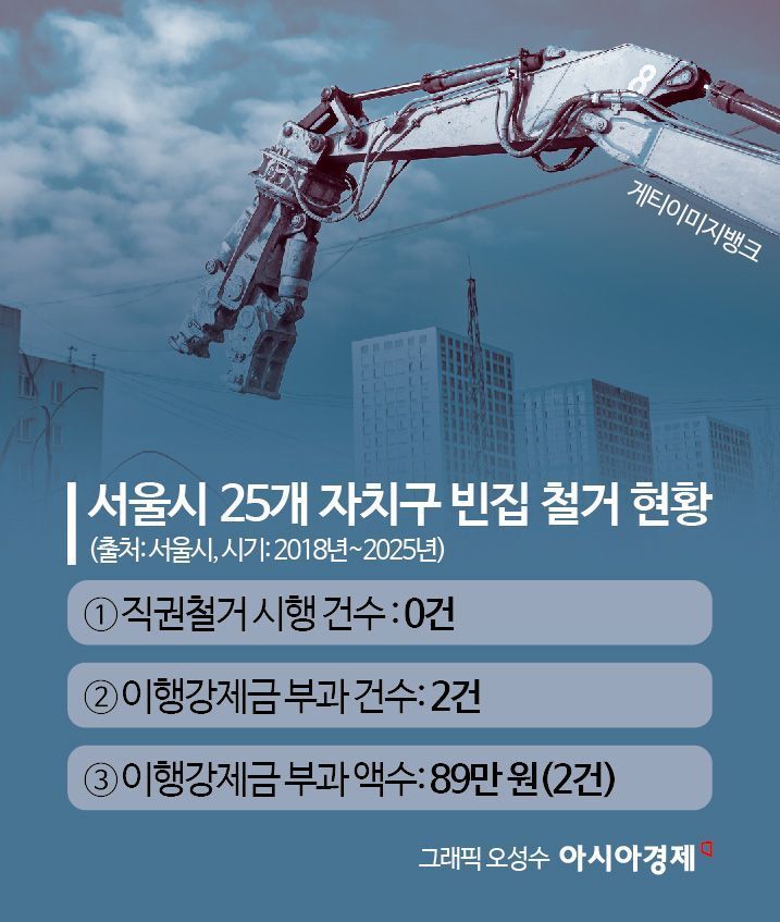 그러나 시에서 직권 철거한 사례는 없다. 예를 들어 서울시는 용산구 내 3개 구역을 빈집밀집구역으로 지정했지만, 별도의 관리 조치는 하지 못했다. 아시아경제 취재 결과 서울시 25개 자치구 가운데 2018년 이후로 7년간 빈집을 직권 철거한 자치구는 단 한 곳도 없었다. 이행강제금의 경우 성동구가 지난해 부과한 2건(총액 89만원)이 전부였다.