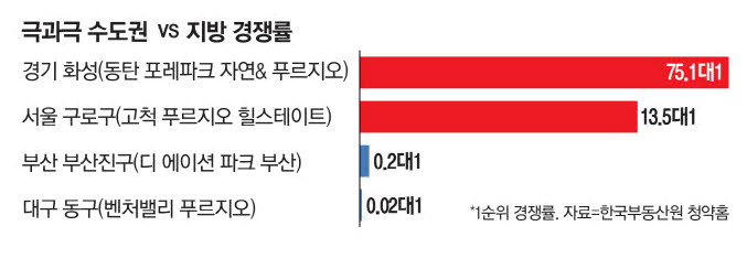 서산 테크노밸리 고운하이츠는 93가구 모집에 14명만 신청했고, 디 에이션 파크 부산도 68가구 모집에 14명만 신청하는 데 그쳤다. 대구 벤처밸리 푸르지오는 540가구 모집에 10명만 신청했다. 하지만 경기 '동탄 포레파크 자연&푸르지오' 351가구 모집에는 2만6372명, 서울 구로구 '고척 푸르지오 힐스테이트' 262가구 모집에는 3543명이 몰려 대조를 이뤘다.