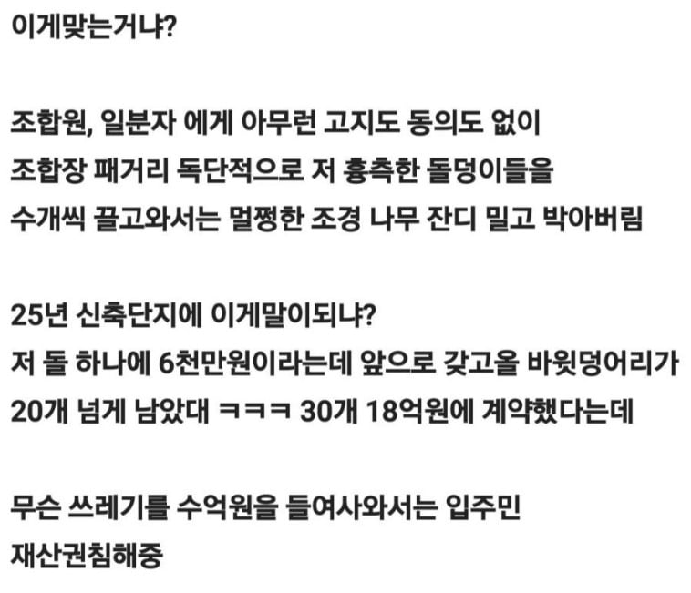 최근 한 익명 커뮤니티에는 "이게 맞는 거냐. 돌 하나에 6000만원이라는데 조합원에게 아무런 고지도 동의도 없이 흉측한 돌덩이들을 끌고 와서 멀쩡한 조경 밀어버리고 박아버렸다"는 글이 게재됐다.