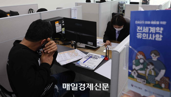 수도권 한 전세피해지원센터를 찾은 전세사기 피해자가 금융지원 상담을 하고 있다. [매경DB]앞으로 전세 계약을 맺기 전에 세입자가 집주인이 전세보증금을 돌려주지 않은 이력이 있는 지 등의 정보를 미리 확인할 수 있다.
