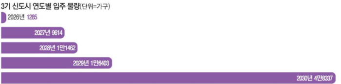 한국토지주택공사(LH)가 이연희 더불어민주당 의원에게 제출한 ‘3기 신도시 연도별 입주 물량 계획’에 따르면 3기 신도시 공공주택 첫 입주는 내년 12월 인천 계양에서 시작된다. 입주 규모는 1285가구에 그친다. 2027년에도 9614가구만 입주한다. 공공분양주택(뉴홈) 전체 물량의 55%인 4만8337가구는 2030년 이후 입주할 전망이다.