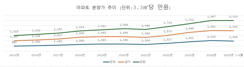 경기와 인천 분양가도 올 들어 3.3㎡당 2000만원대 벽을 돌파했다. 경기 분양가는 2015년 1057만원에서 2024년 1981만원을 기록했다. 올 1~5월에는 2030만원으로 사상 첫 2000만원대를 넘어선 것이다. 국평 분양가가 7억원에 육박한 것이다. 인천도 올 1~5월 2013만원으로 2000만원 벽을 돌파했다. 전국도 2000만원대 시대다.