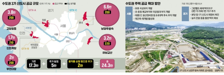 당초 17만3000가구였던 3기 신도시 물량을 지난해 5만 가구 추가한 데 이어 이번에 용적률 완화와 인근 부지 추가 개발로 2만 가구 더 늘릴 계획이다.