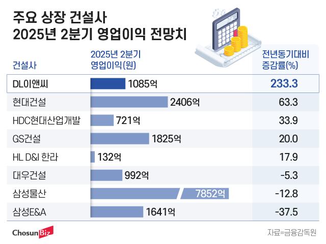 올해 2분기(4~6월) 주요 건설사 중 DL이앤씨의 실적 개선세가 가파를 것으로 전망된다. 지난해 2분기 300억원대의 영업이익에 그쳤던 DL이앤씨는 올해 2분기에는 1000억원이 넘는 영업이익을 기록해 1년 전보다 3배 넘는 영업이익을 기록할 것으로 전망됐다. 주력 사업인 주택부문의 실적 회복세가 나타나고 플랜트 부문도 이익 증가에 힘을 보탤 것으로 분석됐다. 반면 삼성물산, 삼성E&A 등 삼성그룹 건설사들은 전년 같은 기간보다 10~40%가량 영업이익이 줄어들 것으로 예상됐다.