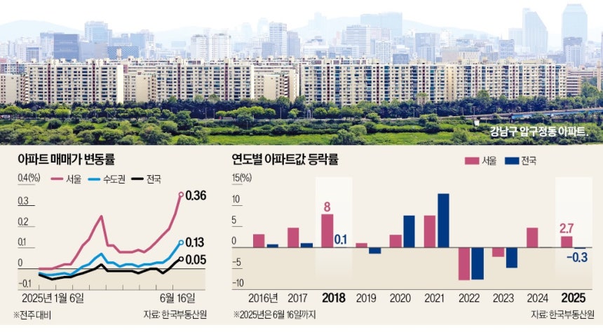 서울 부동산 시장에 ‘패닉 바잉’이 나타나고 있다. 주택 공급 부족, 금리 인하, 정부의 경기 부양책에 집값이 계속 상승할 것으로 예상되지만 대출 규제는 더 강화할 것으로 보이자 서둘러 집을 사려는 움직임이다. 정부가 설익은 규제를 내놓는다면 2018년 때 같은 폭등장이 재연될 것이란 우려도 나온다. ◇강남권·한강 벨트 상승폭 확대19일 한국부동산원에 따르면 이번주(지난 16일) 서울 아파트값은 지난주보다 0.36% 올랐다. 2018년 9월 둘째주(0.45%) 후 6년9개월 만의 최고치다. 강남(0.51%→0.75%) 서초(0.45%→0.65%) 용산(0.43%→0.61%) 등은 상승세가 더 가팔라졌다.