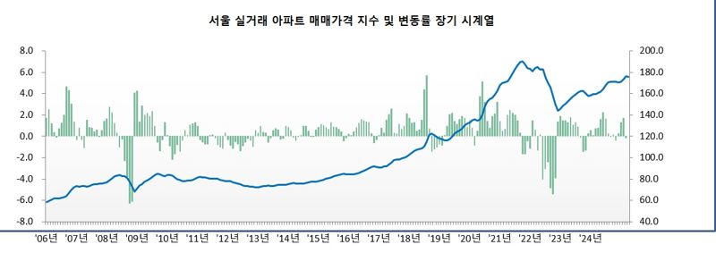 20일 파이낸셜뉴스가 한국부동산원의 서울 아파트 매매 실거래지수를 분석한 결과 지난 2023년 1월을 기점으로 상승세로 돌아선 뒤 짧은 하락기간(3개월)만 있었을 뿐 장기간 상승국면을 유지중이다.