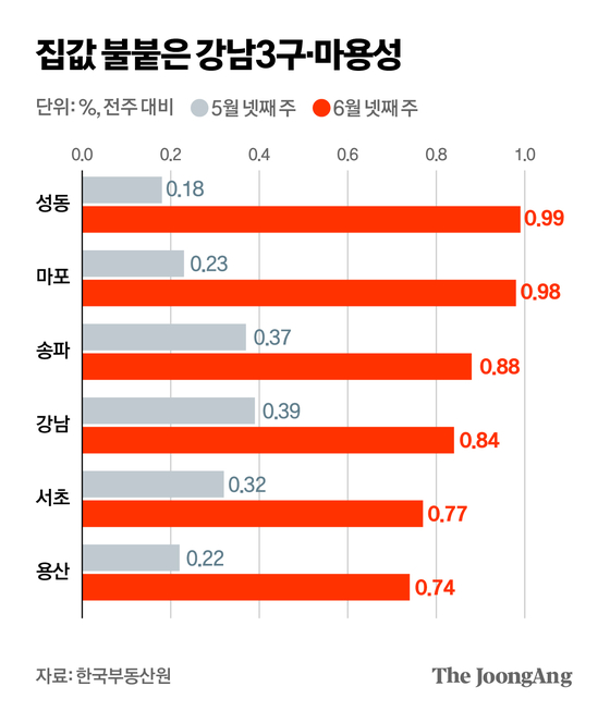 박경민 기자 강남 3구를 비롯해 한강벨트 지역은 ‘비이성적 과열’ 현상이 뚜렷하다. 성동구는 전주 대비 0.99%, 마포구는 0.98%, 광진구는 0.59% 치솟으며 2013년 1월 통계 집계 이후 주간 기준 최대 상승률을 기록했다. 강남구(0.84%)와 서초구(0.77%)도 오름폭을 더 키웠다. 지난주 소폭 하락하며 주춤했던 송파구는 0.88% 상승하며 불길이 재점화 되는 양상이다. 용산구(0.74%), 강동구(0.74%), 동작구(0.53%), 영등포구(0.48%) 등지도 크게 올랐다. 한국부동산원 관계자는 “강남권과 한강벨트 지역 대부분이 2018년 이후 최대 상승 폭을 기록했다”고 설명했다.
