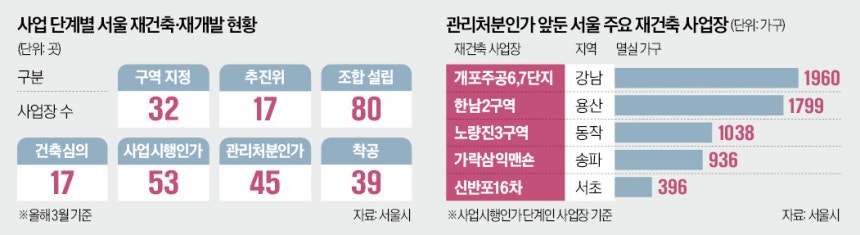 30일 정비업계와 서울시 등에 따르면 올해 3월 기준 사업시행인가를 마치고 관리처분인가를 앞둔 사업지는 53곳, 4만8339가구에 이른다. 용산구 한남2구역, 강남구 개포 주공6·7단지, 동작구 노량진1구역, 송파구 가락삼익맨숀 등이 포함돼 있다. 이들 사업지는 아직 관리처분인가를 받지 못해 모두 이번 대출 제한 대상에 해당한다.