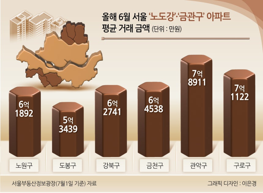 이들 지역은 평균 시세가 6억원에서 8억원 사이 분포돼있어, 정부의 주택담보대출 6억원 한도 규제를 적용해도 담보인정비율(LTV) 70%까지 대출이 가능해 수혜지역으로 꼽힌다. 서울부동산정보광장에 따르면 지난 1일 기준 노도강·금관구의 아파트 평균 매매 금액은 ▷노원 6억1892만원 ▷도봉 5억3439만원 ▷강북 6억2741만원 ▷금천 6억4538만원 ▷관악 7억8911만원 ▷구로 7억1122만원 등으로 집계됐다.