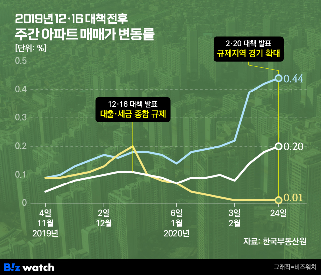 2019년 12·16 대책 전후 매매가 변동률/그래픽=비즈워치다만 대책 발표 이후 시장은 정부 의도와는 다르게 흘러갔다. 규제지역 내 9억원 넘는 아파트에 대한 LTV가 축소되면서 9억원 미만 비규제지역 아파트로 수요가 쏠리는 이른바 '풍선효과'가 나타났기 때문이다. 이로 인해 서울 지역 집값 상승세는 한풀 꺾였지만, 경기 남부권 지역인 수원·용인·성남시 등을 중심으로 오름세가 심화했다.▷관련기사:19번째 부동산대책 예고…이러다 20번, 21번도 나올라(2020년2월19일)실제 한국부동산원 주간아파트가격동향을 살피면 12·16 대책 발표 직후인 12월 넷째 주(23일 기준) 경기 매매가 변동률은 0.18%에서 이듬해 2월 셋째 주(17일 기준) 0.42%로 무려 0.24%포인트 급등했다. 같은 기간 서울은 0.10%에서 0.01%로 변동률이 크게 내려앉았다.