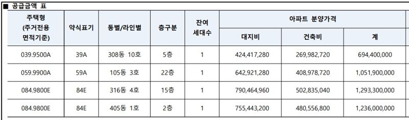 자료 : 청약홈 분양가는 상한제가 적용된 예전 공급 당시 가격이다. 전용 39㎡(5층)는 6억9440만원, 59㎡(22층)는 10억5190만원, 84㎡(2층·15층)는 12억원대이다.