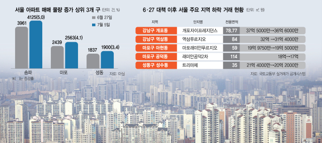 6일 부동산 업계에 따르면 지난달 27일 정부의 대출 규제 발표 이후 매수 문의가 끊기면서 집주인들이 호가를 낮춰 매물을 내놓고 있다. 특히 올해 들어 단기간 가격이 상승한 강남 3구 및 한강벨트 단지를 중심으로 호가가 하락하는 상황이다.