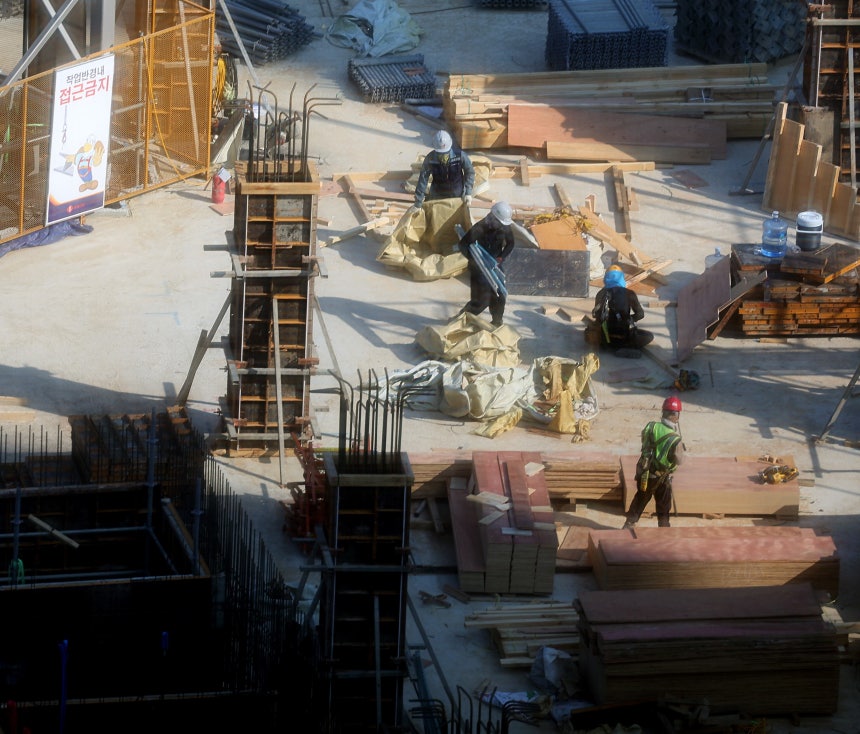 지난 3일 부산의 한 아파트 공사현장에서 노동자들이 뜨거운 햇빛 아래 작업을 하고 있다. /연합뉴스