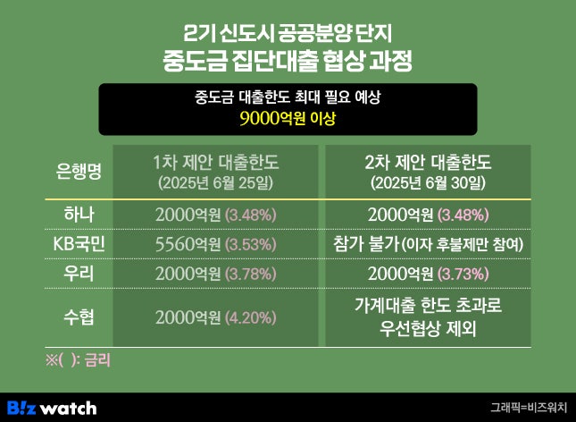 대책 전엔 중도금 '최대' 제안하더니… 9일 분양업계에 따르면 최근 2기 신도시 중 한 곳에 조성한 2개 단지를 공공분양 중인 시행사는 KB국민은행으로부터 지난달 30일 집단대출 불참 의사를 전달받았다. KB국민은행은 기존 4개 중도금 대출 우선협상 은행 중 가장 제안금액이 컸던 곳이다.