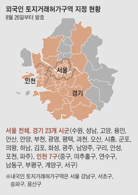 국토교통부는 21일 중앙도시계획심의위원회를 열고 서울 25구(區) 전체와 경기도 23개 시·군, 인천 7구를 외국인 토지거래허가구역으로 지정했다. 지금까지 외국인들은 부동산을 매수하면 60일 안에 신고만 하면 됐지만, 이제는 관할 시·군·구청 등에 입주 계획과 자금 조달 계획서를 내고 허가를 받아야 한다. 허가일로부터 4개월 이내에 입주해서 2년 실거주를 해야 한다. 경기 이천·양평·여주, 인천 강화·옹진 등 외곽 지역은 이번 조치에서 제외됐다.