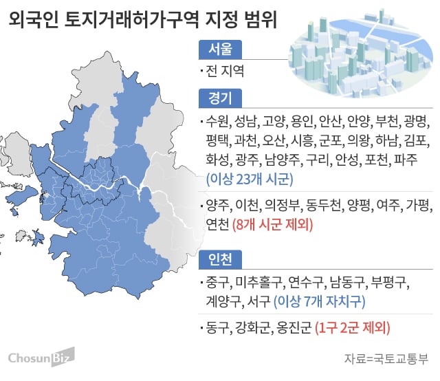 국토교통부는 21일 중앙도시계획위원회 심의를 거쳐 서울시 전역, 인천시 7개구, 경기도 23개 시·군을 외국인 토지거래허가구역으로 지정했다.