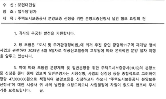 26일 정비업계에 따르면 지난 20일 광명11R재개발조합은 현대건설에 '주택도시보증공사(HUG) 분양보증 신청을 위한 분양보증신청서 날인 협조 요청의 건'이란 제목의 공문을 보냈다.