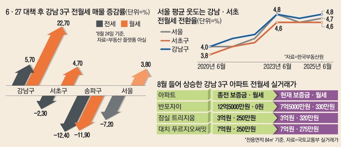 우리나라에서 유독 발달한 임대차 계약 방식인 전세제도가 최근 몇 년 사이에 빠르게 줄고 있는 가운데 20일 서울의 한 재건축 아파트 단지 부동산에 월세물건들이 안내되고 있다. 2025.7.20 [이승환 기자]정부의 6·27 대출 규제 이후 서울 강남 3구(강남·서초·송파) 아파트 단지에서 전세의 월세화가 가속화하고 있다. 강남 3구는 전통적 학군 수요와 생활 편의성 때문에 장기 거주 성향과 전세 기반이 탄탄한 지역으로 꼽힌다. 그러나 정부의 대출 규제 발표를 계기로 전세 매력이 ‘확’ 줄면서 강남 3구 임대 시장이 월세 중심으로 크게 변동 중인 셈이다.강남 3구 주요 단지에서 전세의 월세화 흐름은 실거래에서 한눈에 나타나고 있다. 26일 국토교통부 실거래가에 따르면 서울 서초구 반포동 반포자이 84㎡는 이달 5일 보증금 7억5000만원에 월세 330만원에 계약을 맺었다. 종전엔 보증금 12억5000만원에 월세 부담이 전혀 없는 ‘순수 전세’ 였는데 계약갱신청구권을 사용하면서 ‘보증부 월세’로 바뀌었다. 이 단지와 이웃인 반포써밋은 이달 체결된 전월세 신규 계약은 총 5건 중 4건이 보증부 월세였다.