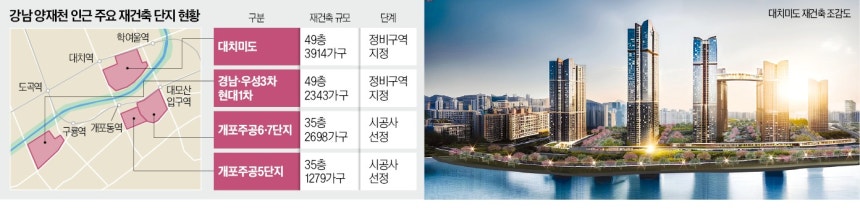 "학군·교통 좋고 주거환경도 쾌적"양재천과 접한 서울 강남구 대치동과 개포동 일대 노후 단지의 재건축 사업에 속도가 붙고 있다. 대치미도와 개포경남·우성3차·현대1차(경우현) 등 대단지들이 최근 인허가 첫 관문을 넘었고, 양재천 이남의 개포주공 5~7단지는 시공사 선정도 마쳤다. 탄탄한 교통·생활 인프라에다 쾌적한 주거 환경까지 갖춘 ‘양재천 벨트’가 강남권의 새로운 부촌으로 떠오르고 있다.