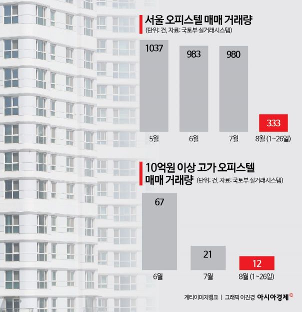 26일 국토교통부 실거래가 시스템에 따르면 8월1일부터 26일까지 약 한 달간 서울 오피스텔 매매 거래량은 333건으로, 전달(983건)대비 66.1% 감소했다.