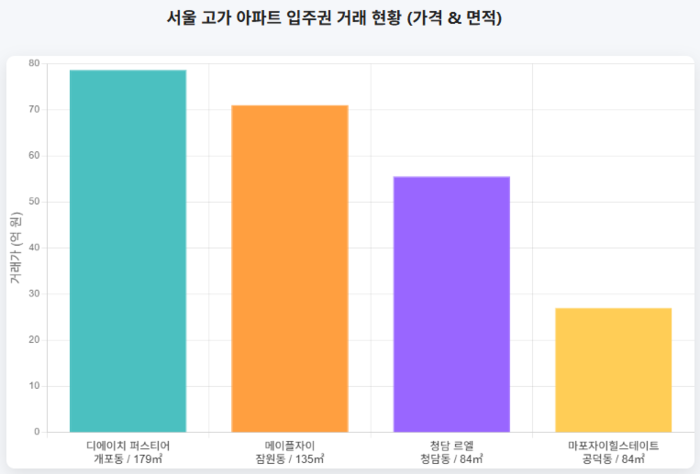 일례로 지난달 15일 강남구 개포동 ‘디에이치 퍼스티어 아이파크’ 전용면적 179㎡ 26층 입주권이 78억6500만원에 거래됐고, 같은 달 15일에는 서초구 잠원동 ‘메이플자이’ 135㎡ 11층 입주권이 71억원에 매매된 바 있다.이달 6일에는 강남구 청담동 ‘청담 르엘’ 84㎡ 28층 입주권이 55억5000만원에 팔리기도 했다.