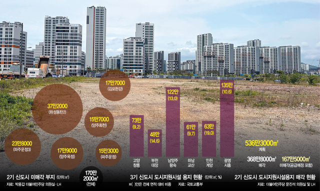 지역별로 보면 화성 동탄2의 미매각 부지 규모가 37만 2000㎡로 가장 많았다. 이어 파주 운정3(23만 8000㎡), 양주 옥정(17만 9000㎡), 김포 한강(17만 7000㎡), 양주 회천(15만 7000㎡) 등이 뒤를 이었다. 특히 화성 동탄2와 파주 운정의 경우 아파트를 지을 수 있는 총 9만 4000㎡ 규모의 공동주택 용지가 미매각 상태다.