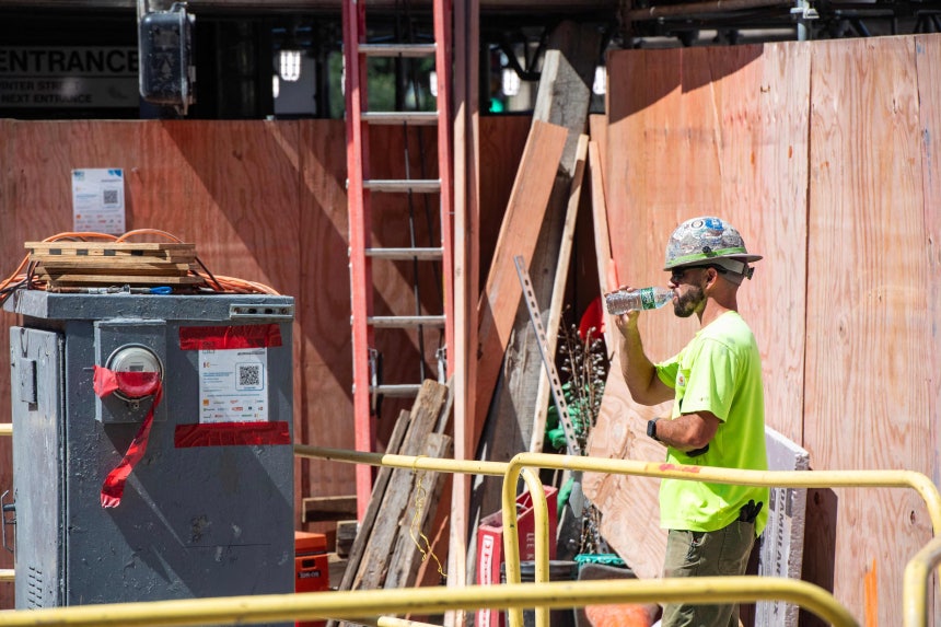 지난 7월 29일(현지시각) 미국 매사추세츠주 보스턴에서 한 건설 노동자가 작업 중 물을 마시고 있다. /AFP=연합뉴스
