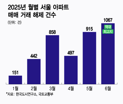 거래 해제가 전체 거래에서 차지하는 비중도 급등했다. 2024년 내내 해제 비율은 1.9~4.6% 수준에 머물렀으나, 올해 들어 △2월 6.6% △3월 8.2% △4월 9.0% △5월 11.1% △6월 8.9%를 기록하며 단순한 변동을 넘어 시장 불안정 신호로 평가된다.