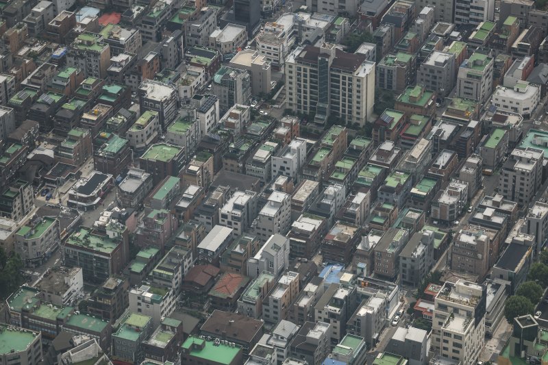 서울 송파구의 롯데월드타워 스카이라운지에서 다가구·다세대·연립주택이 보이고 있다. 사진=뉴시스[파이낸셜뉴스] 전세보증금 반환보증 가입 조건이 주택가격의 70%로 강화될 경우 전국 빌라 전세 계약 10건 중 8건은 기존과 동일한 보증금으로 전세보증 가입이 어려워진다는 분석이 나왔다.