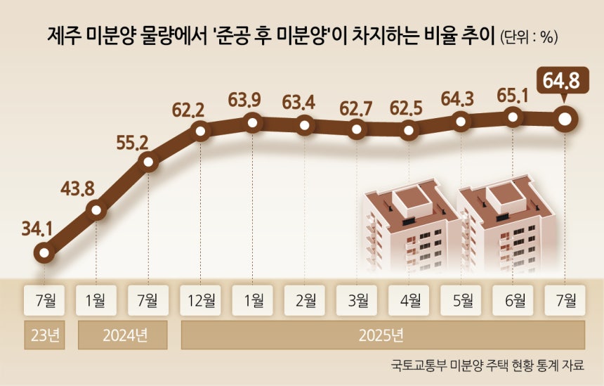 제주의 악성 미분양 비율은지난 6월 기준 65.1%로 역대 최고치를 기록했다. 이어 지난달에도 64.8%로 집계돼 완공된 후에도 불이 꺼진 채 주인을 찾지 못한 빈집이 10가구 중 6가구로 나타났다. 작년 7월(55.2%) 대비 9.6%포인트 증가한 수치다. 2023년 7월(34.1%)과 비교하면 2년 새 무려 30.7% 뛰었다.