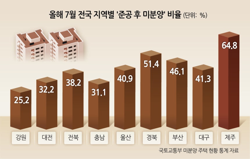전반적으로 지방 분양 시장이 침체됐지만, 제주는 악성 물량 비중이 높다는 점에서 상황이 더 심각하다. 올해 7월 기준 지역별 악성 물량 비율을 살펴보면 경북(51.4%)·부산(46.1%)·대구(41.3%)·울산(40.9%) 등으로 제주(64.8%)가 압도적으로 높다. 충남(31.1%)·전북(38.2%)·대전(32.2%)·강원(25.2%) 등과 비교해도 제주의 악성 비중이 2배 가까이 높다.