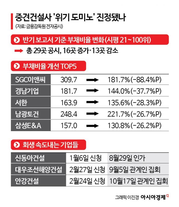 부채비율이 크게 낮아진 기업으로는 SGC이앤씨(309.7%→181.7%·-88.0%포인트), 경남기업(181.7%→144.0%·-37.7%포인트), 서한(163.9%→135.6%·-28.3%포인트), 남광토건(248.4%→221.7%·-26.7%포인트), 삼성E&A(157.0%→130.8%·-26.2%포인트) 등이 꼽힌다. 반면 신세계건설(50%포인트), HL D&I 한라(46%포인트) 등 일부를 제외하면 부채비율이 크게 증가한 곳은 없었다.
