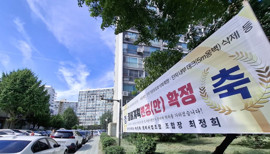 지난 2일 최고 49층, 5893가구 규모 재건축계획안이 서울시 심의를 통과한 대치동 은마아파트에 재건축 확정을 축하하는 플래카드가 붙어 있다. 이승환 기자