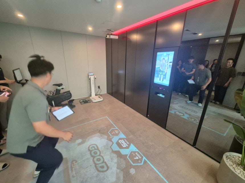 현대건설 관계자가 올라이프케어하우스 내에 있는 '웰니스(Wellness) 솔루션' 중 운동 기능을 직접 시연하고 있다./사진=김평화 기자다음 체험 공간은 올라이프케어 하우스. 말 그대로 삶의 모든 부분을 챙겨준다는 의미다. 이곳은 수면·영양·운동·메디컬·응급 대응·청정주거 등 주거 속 건강 케어를 한눈에 보여준다.침대에 누워 눈을 감자, 방 안의 공기가 서서히 바뀐다. 온도는 낮아지고 조명은 은은하게 줄어든다. 수면 솔루션 '헤이슬립(Hey, Sleep)'이 작동한 것이다. 현대건설 관계자는 "실험 결과 수면 질이 평균 10% 이상 개선됐다"고 전했다.